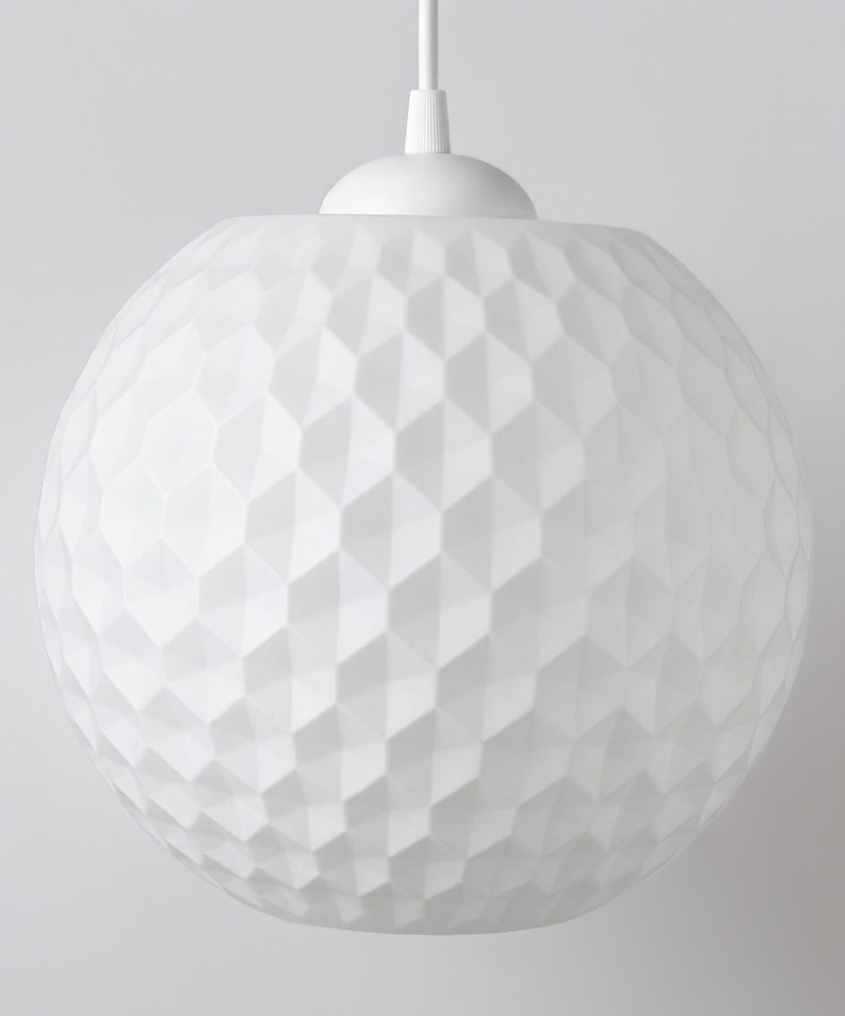 Diese moderne Pendelleuchte überzeugt durch ihre klare Form und ihre besondere Oberflächenstruktur. Das geometrische Muster erzeugt ein sanftes, diffuses Licht und sorgt für eine gemütliche Wohnatmosphäre.