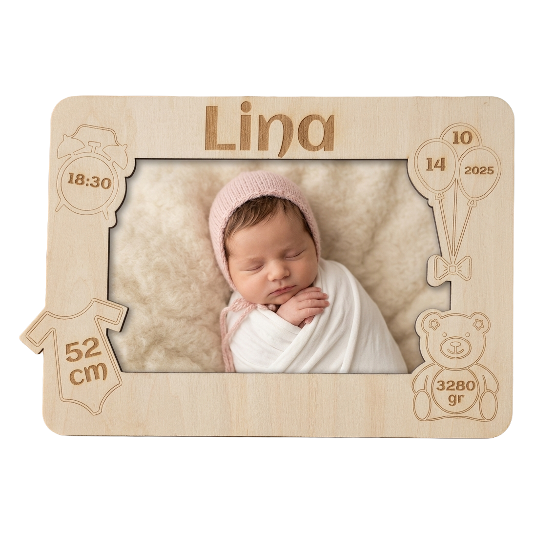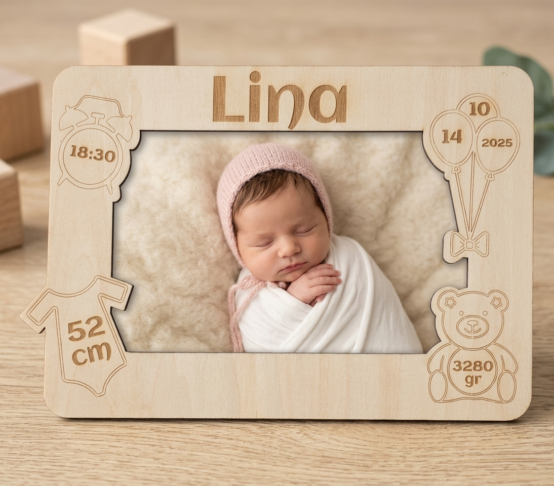 Alle wichtigen Geburtsdaten werden präzise per Lasergravur eingearbeitet. In Kombination mit einem persönlichen Foto (15×10 cm) entsteht ein emotionales Erinnerungsstück, das ein Leben lang bleibt.